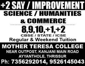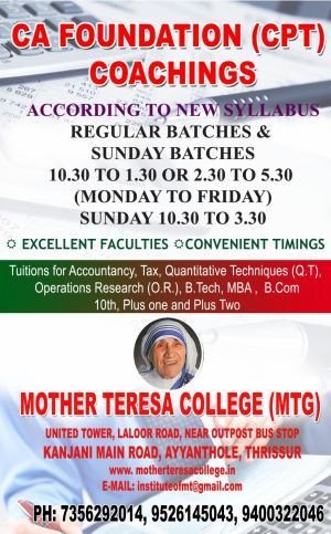 Mother Teresa College was established in 2014. We are one of the leading institute based in Thrissur-Kerala, India. We have well qualified & experienced faculties to provide interesting classes & quality service ,they will take care the students to achieve their goals. Through our dedicated efforts, we gained an impeccable reputation in the industry. Every individual have their own interest and talent, we find it and give a shape to it by placing them as a Star. It is our policy to maintain high standards in teaching, which surpasses our student’s needs & expectations. We Offers Courses of MBA, BBA, B.COM, M.COM, BSC. MATHS MSC. MATHS , BA (All Subjects), MA (English, ...